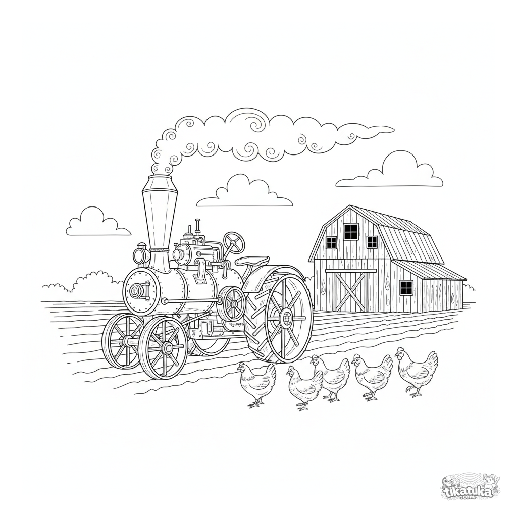 Detailliertes Ausmalbild eines alten Dampftraktors, der ein Feld pflügt. Für Kinder von 8-12 Jahren. Mit Hühnern, Furchen und einer Scheune im Hintergrund.