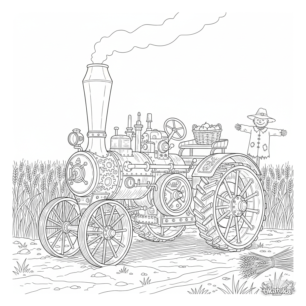 Detailliertes, realistisches Ausmalbild eines alten Dampftraktors auf einem goldenen Feld. Anspruchsvolles Ausmalbild für Kinder von 8-12 Jahren.