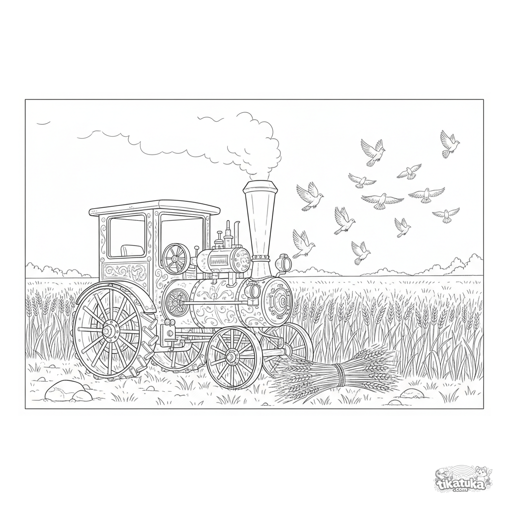 Ausmalbild eines detaillierten antiken Dampftraktors, der am Rand eines goldenen Weizenfeldes geparkt ist. Für Kinder von 8 bis 12 Jahren.