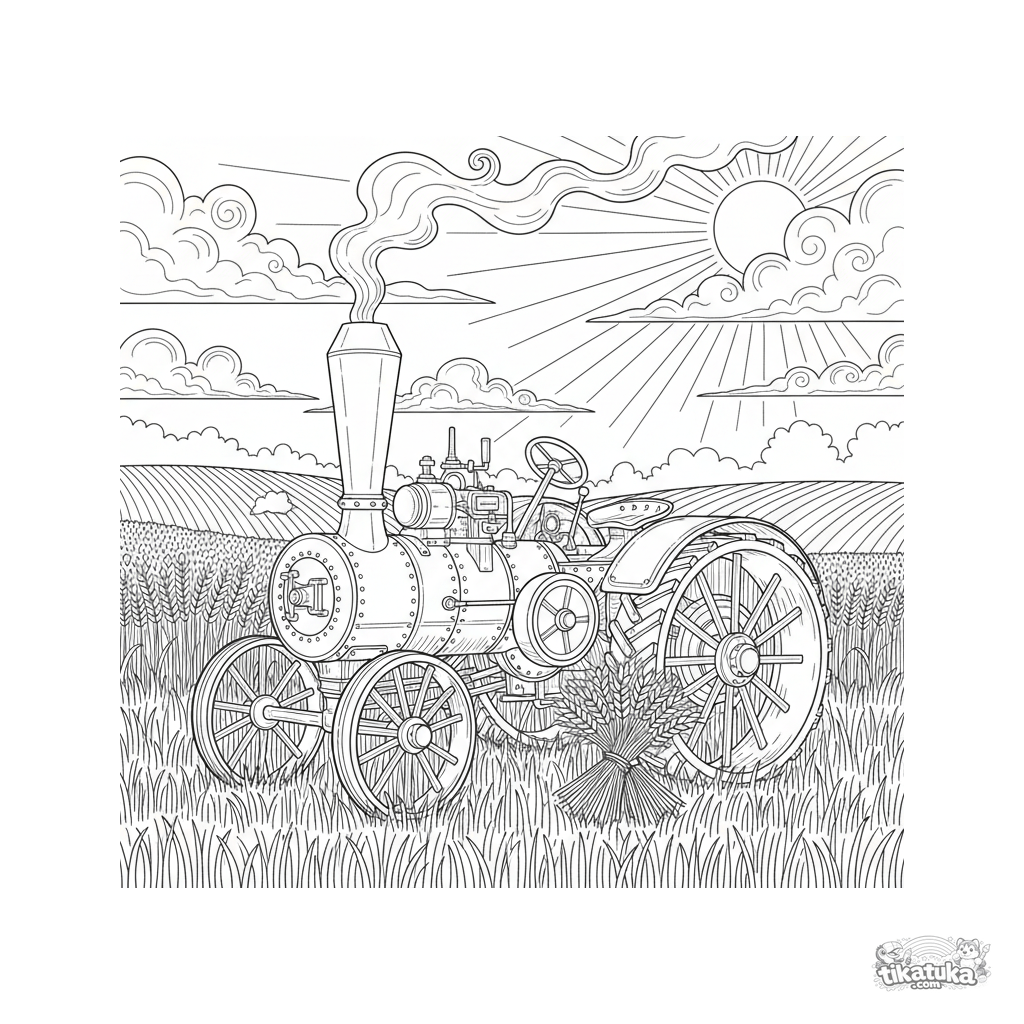 Detailliertes Ausmalbild eines antiken Dampftraktors auf einem Weizenfeld. Für Kinder von 8 bis 12 Jahren. Viele mechanische und natürliche Details.