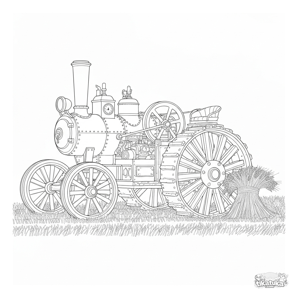 Detailliertes, realistisches Ausmalbild eines antiken Dampftraktors auf einem Feld. Für Kinder von 8-12 Jahren.