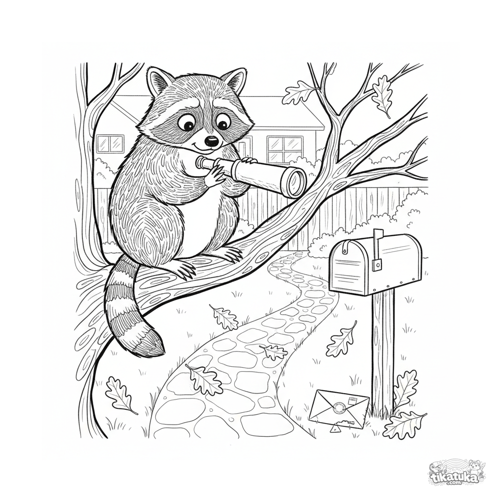 Detailliertes Ausmalbild für Kinder 10-12: Ein besorgter Waschbär mit Fernrohr im Baum beobachtet einen Briefkasten und wartet auf den Zahltag. Szene im Aquarell-Skizzen-Stil.