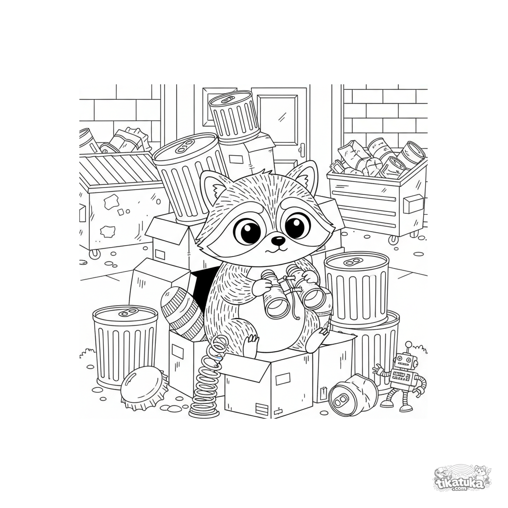 Ausmalbild für Kinder 10-12: Ein besorgter Waschbär mit selbstgebautem Fernglas lugt aus einer Mülltonnen-Festung, um eine Lieferung zu erspähen. Lustige detaillierte Szene im Doodle-Stil.