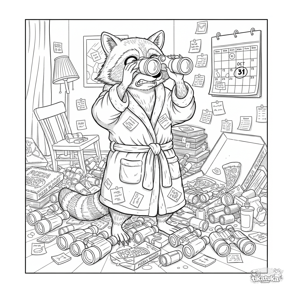 Ausmalbild für Kinder 10-12: ein ängstlicher Waschbär in einem Bademantel in einem Fernglas-Haufen in einer unordentlichen Wohnung, der auf den Gehaltstag wartet. Detaillierte Szene im Graphic-Novel-Stil.
