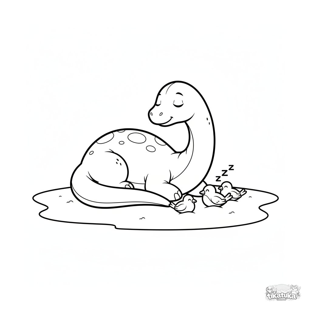 Sehr einfaches Ausmalbild für Kleinkinder von 2-3 Jahren: Ein großer freundlicher Apatosaurus schläft fest auf dem warmen Sand eines urzeitlichen Strandes. Große geschlossene Formen.