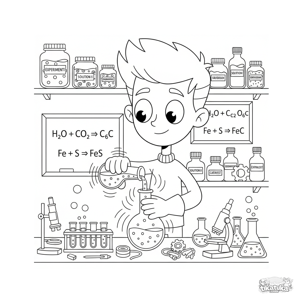Detailliertes Ausmalbild für ältere Kinder 10-12: Ein Erfinderlehrling führt in einem geheimen Labor ein Chemieexperiment mit einer leuchtenden Formel zwischen Kolben und Reagenzien durch.
