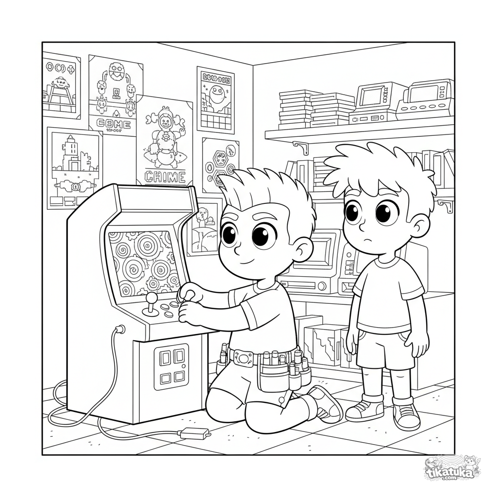 Ausmalbild für 10-12 Jahre: Ein Modder testet einen individuellen Arcade-Schrank in einer Spielecke im Keller. Detaillierte Steuerung, Poster und Werkzeuge zum Ausmalen.