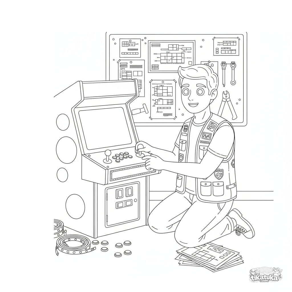 Technisches Ausmalbild: Ein Modder testet einen maßgeschneiderten Arcade-Schrank in einer Kellerwerkstatt. Details: Tasten, LEDs, Schaltpläne.