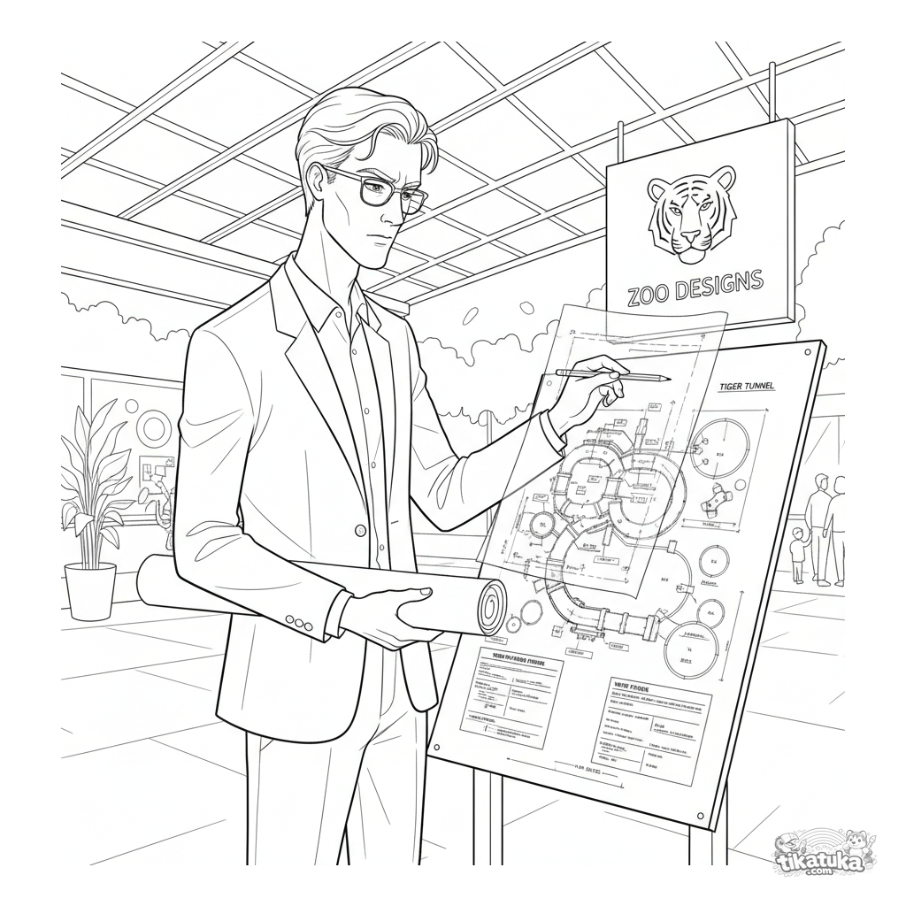 Detailliertes Ausmalbild für Kinder 10-12 Jahre. Ein Architekt mit Brille zeichnet auf einer transparenten Folie den Bauplan eines neuen Tigergeheges.