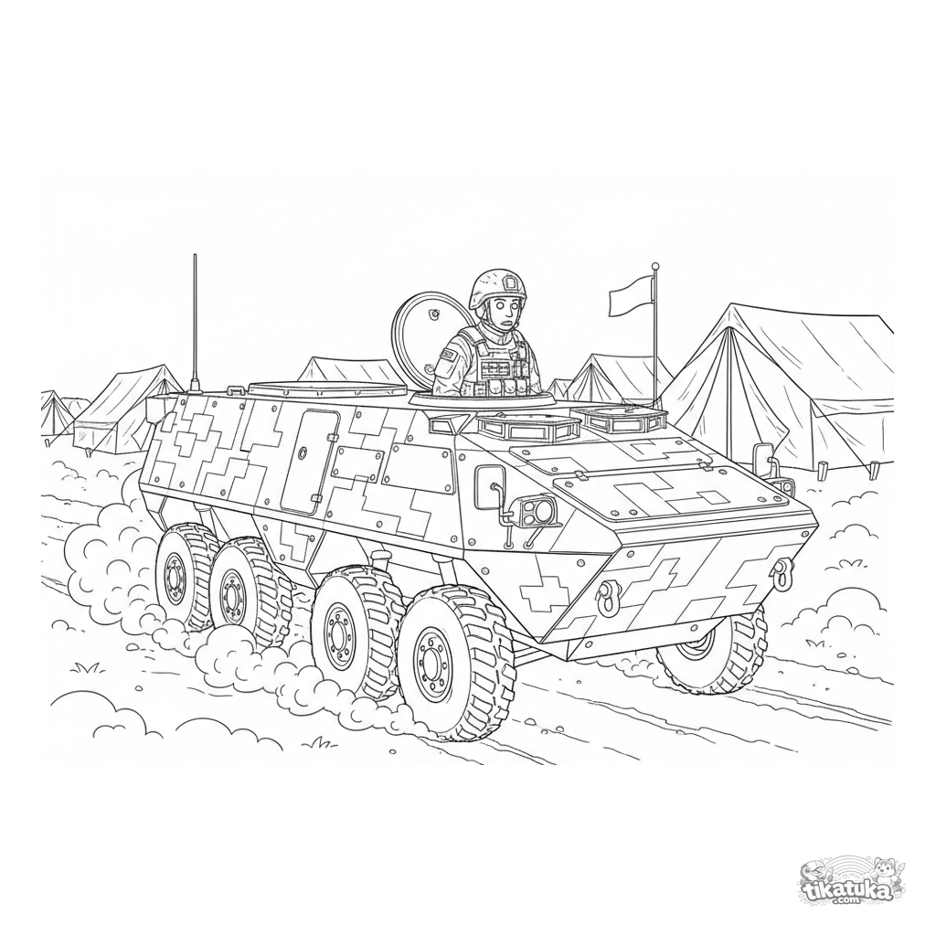 Detailliertes Ausmalbild für ältere Kinder 10-12: Ein modernes gepanzertes Mannschaftstransportfahrzeug kommt am Feldhauptquartier an. Ein Soldat schaut aus der Luke und mustert die Zelte.