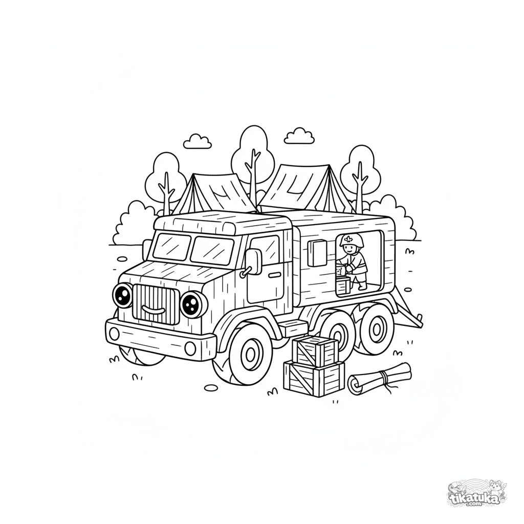 Ausmalbild für Kinder 4-6: Ein gepanzertes Fahrzeug liefert Kisten mit Vorräten an ein Feldhauptquartier mit Zelten. Einfache Formen, freundliches Design.