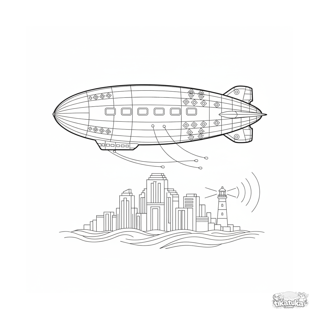 Detailliertes Ausmalbild eines Art-Deco-Zeppelins über einer Küstenstadt in der Dämmerung. Für 10-12 Jahre. Elegante Linien, Beobachtungsfenster, Stadtsilhouette.