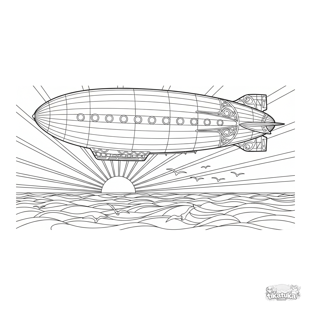Ausmalbild für ältere Kinder von 10 bis 12: Ein majestätischer Art-Deco-Passagierzeppelin aus den 1930er Jahren gleitet sanft über einen weiten Ozean bei Sonnenuntergang, mit Reihen von Beobachtungsfenstern.