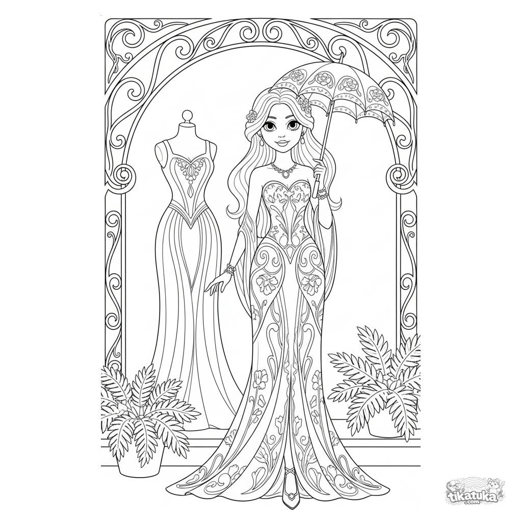 Ausmalbild für 10-12 Jahre: ein elegantes, im Art-Nouveau-Stil inspiriertes Kleid mit Blumenstickerei im Schaufenster. Detaillierte Szene mit Sonnenschirm und Dekoration.