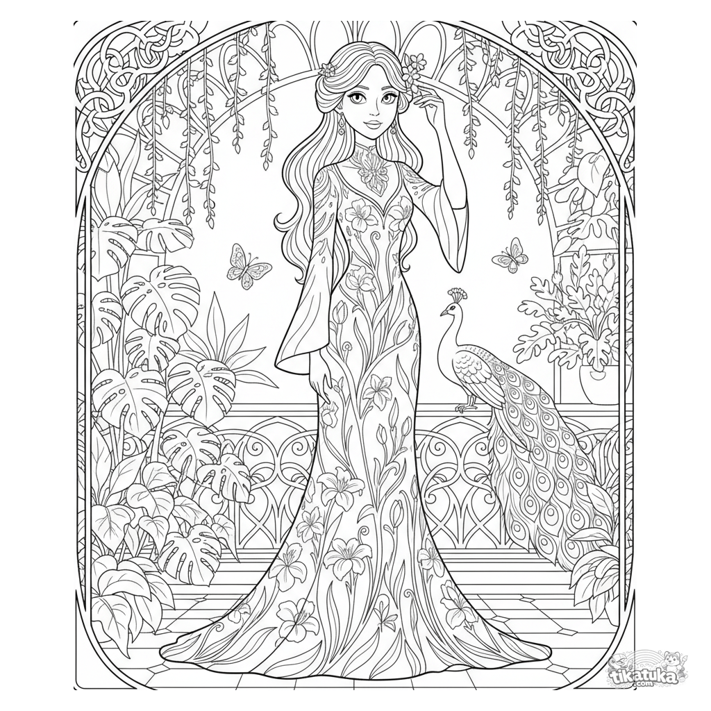 Ausmalbild für Mädchen 10-12: Ein elegantes Art-Nouveau-Kleid mit Blumenmustern in einem sonnigen Wintergarten. Hoher Detailgrad, volle Figur, breite Ränder.