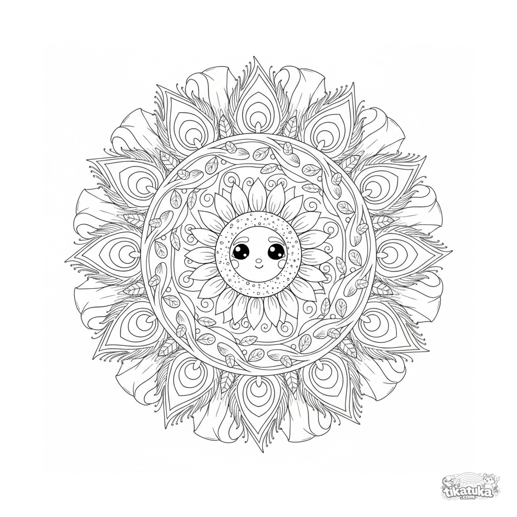 Komplexe Art-Nouveau-Blumenmandala-Ausmalbild für 10-12 Jahre. Sonnenblumenmitte, Ringe aus fließenden Ranken, Pfauenfedern und Lilien. Vintage-Muster.