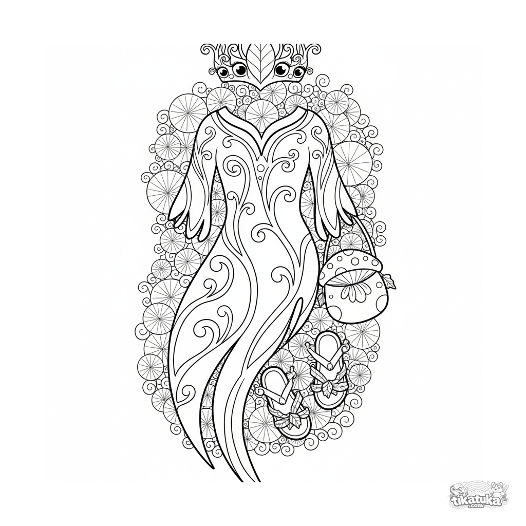 Ausmalbild für Mädchen 10-12: eine detaillierte Flachlage eines Fantasy-Waldgeist-Tunika-Outfits im Art-Nouveau-Stil.