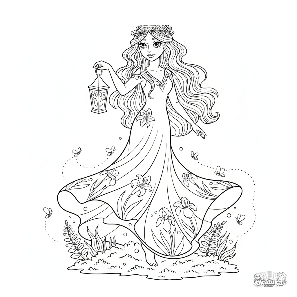Ausmalbild für 10-12 Jahre: Eine Art-Nouveau-Waldelfe in einem fließenden Kleid dreht sich in einer mondbeschienenen Lichtung. Detaillierte Szene mit Laterne und Glühwürmchen.
