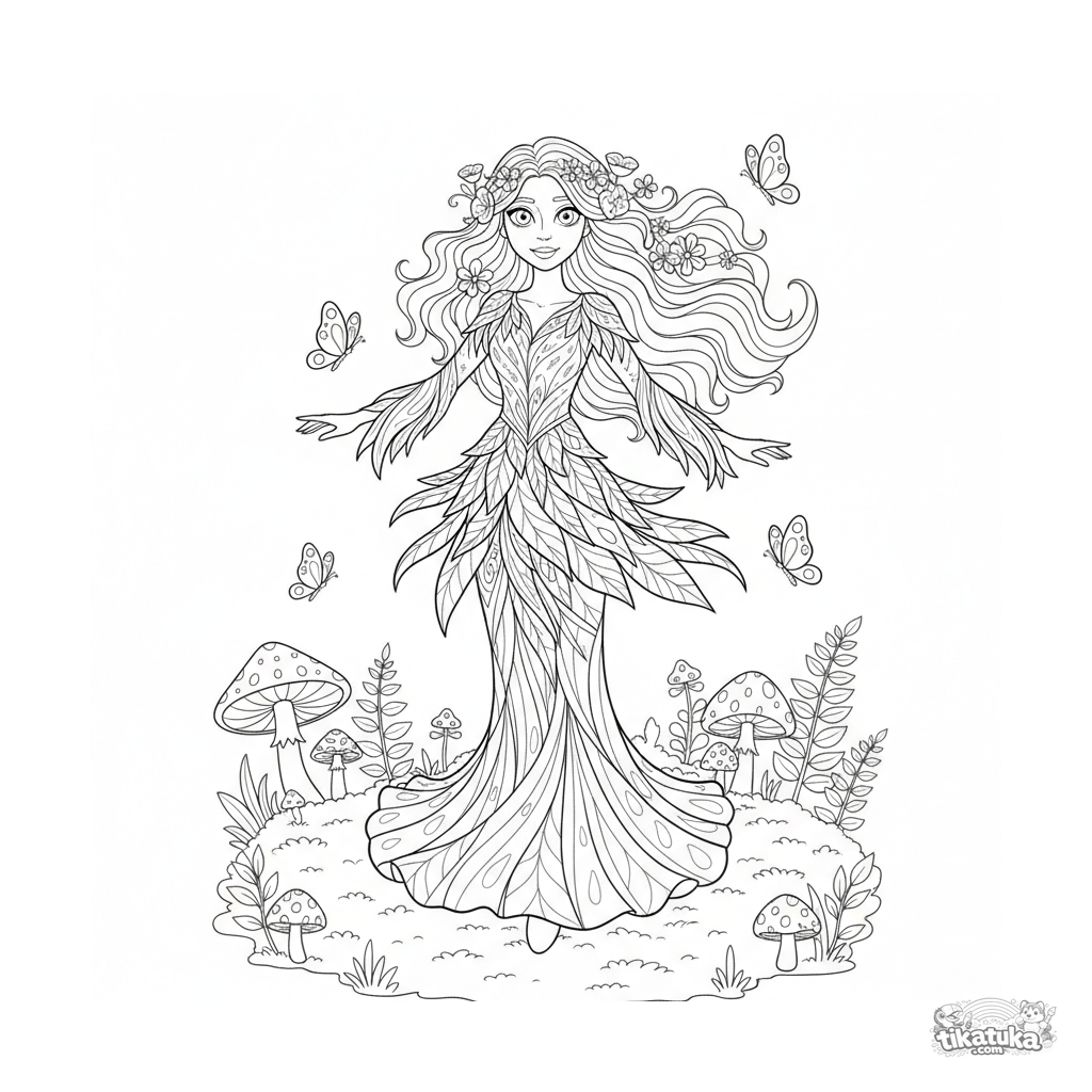 Ausmalbild für Mädchen 10-12: Eine Waldfee in einem detaillierten Blätterkleid wirbelt auf einer Lichtung. Komplexe Jugendstil-Szene mit Schmetterlingen und Farnen.