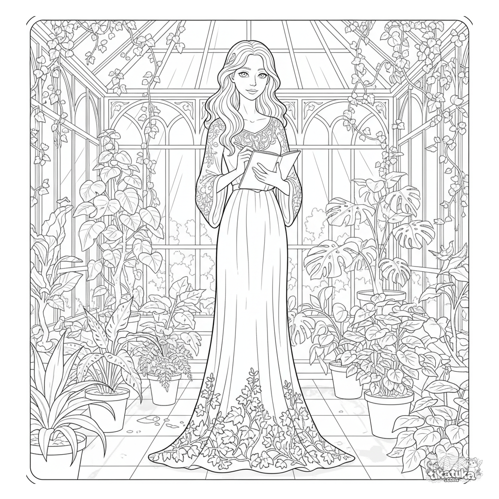 Ausmalbild für 10-12 Jahre: elegantes Art-Nouveau-Kleid mit Efeustickerei in einem sonnigen Wintergarten. Hochdetaillierte Szene mit inspirierender Umgebung.