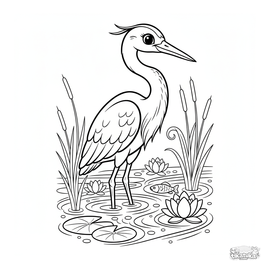 Ausmalbild für 7-9 Jahre im Jugendstil: Ein anmutiger Reiher im Schilf an einem Bach. Dekorative Linien, Seerosen und Wasserwellen.