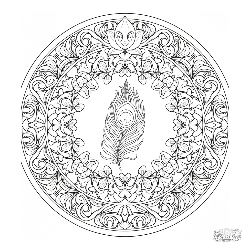 Elegantes Art-Nouveau-Pfauenfeder-Mandala-Ausmalbild für 10-12 Jahre. Zentrales Federauge, fließende Peitschenhieb-Linien, Lilien und Iris im symmetrischen Zier-Muster.