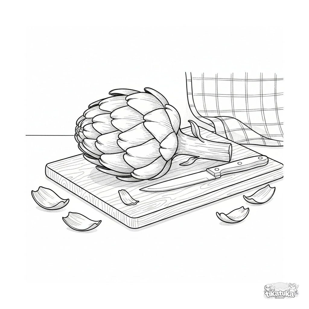 Detailliertes Ausmalbild einer Artischocke auf einem Schneidebrett in einer Küche. Für Kinder von 10-12 Jahren. Realistischer Aquarell-Skizzen-Stil.