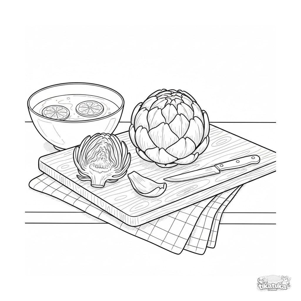Detailliertes Ausmalbild einer Artischocke auf einem Küchenbrett für 10-12 Jahre. Zeigt Messer und Schale im Aquarellskizzen-Stil.