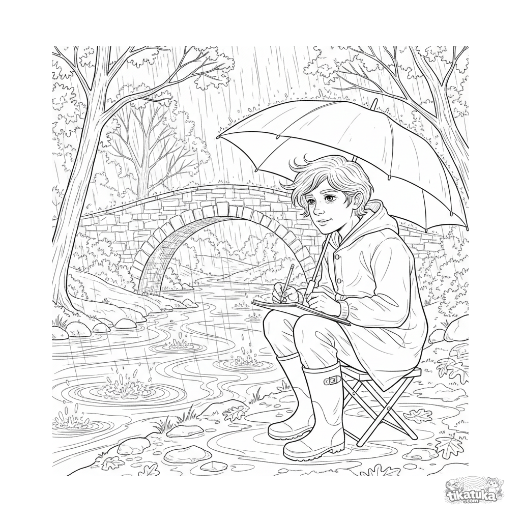 Ausmalbild für ältere Kinder 10-12 Jahre: ein Künstler in einer Regenjacke und Stiefeln zeichnet eine alte Brücke während eines Herbstplatzregens.