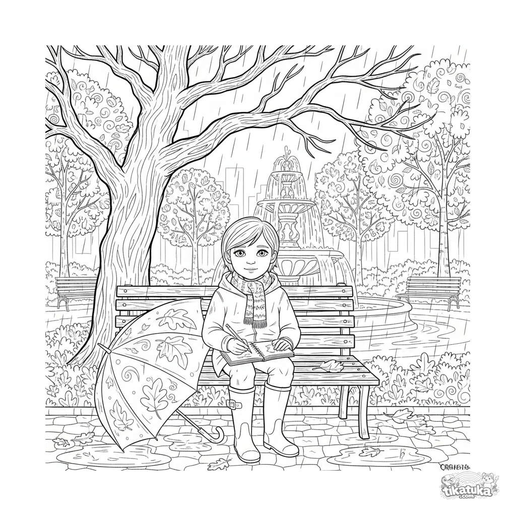 Detailliertes Ausmalbild für ältere Kinder 10-12 Jahre: ein Künstler auf einer Parkbank zeichnet an einem regnerischen Herbsttag. Mehrschichtige Szene mit Hintergrund und Texturen.