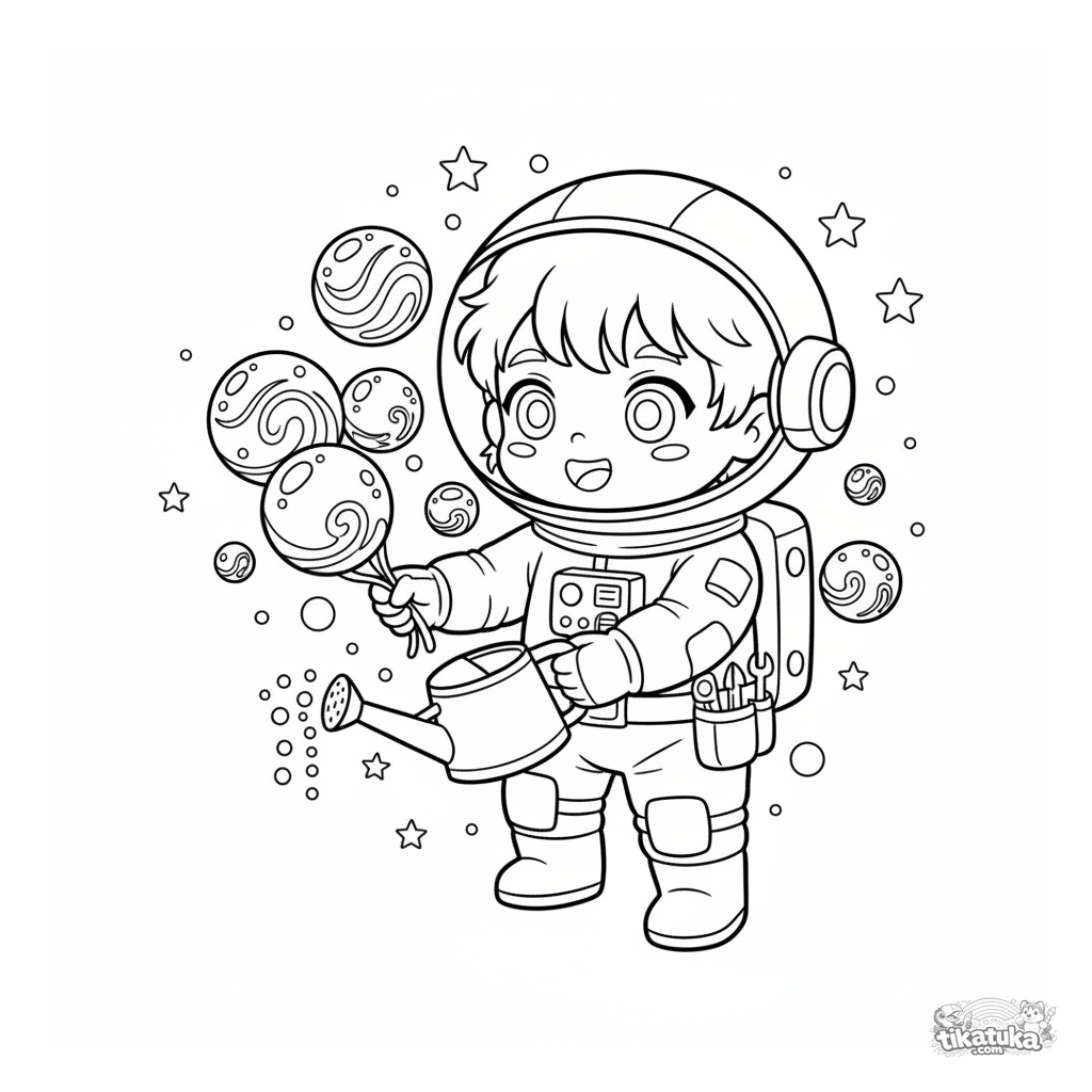 Ausmalbild für Kinder von 4-6 Jahren: Ein fröhlicher Weltraumgärtner pflegt leuchtende Pflanzen, die um ihn im All schweben.