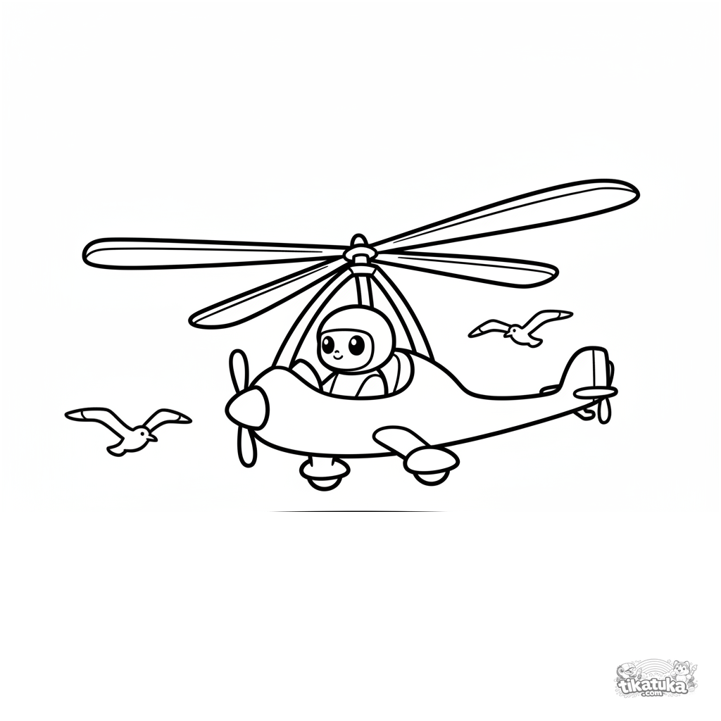 Ausmalbild für Kleinkinder 2-3: Ein ungewöhnlicher Tragschrauber mit einem großen Rotor fliegt über den Ozean. Sehr große, klare Umrisse, minimale Details.
