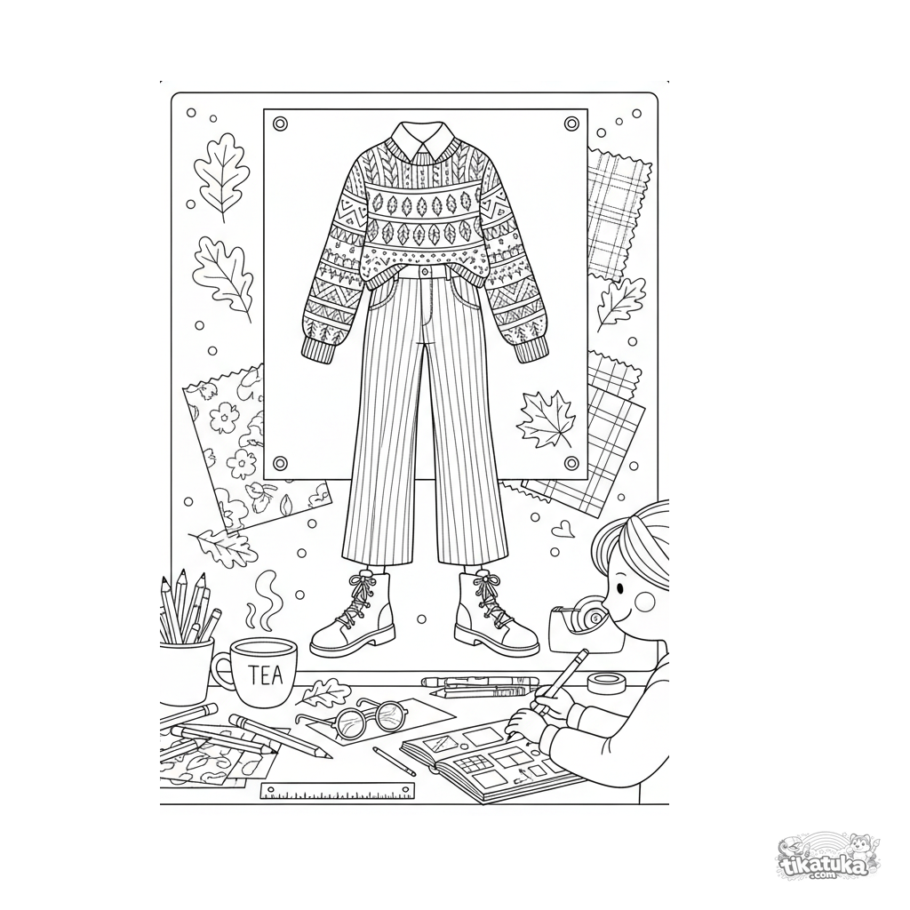 Kreatives Ausmalbild für 10-12 Jahre: der Schreibtisch eines Designers mit einer Skizze eines herbstlichen Schichtlooks, Buntstiften, Stoffmustern und herabgefallenen Blättern.
