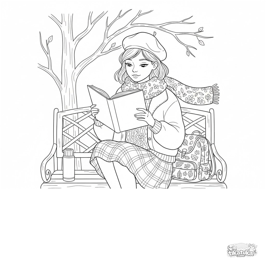 Ausmalbild für Mädchen 10-12: Eine detaillierte Herbstpark-Szene, in der ein Mädchen in einem Schichten-Outfit auf einer Bank ein Buch liest, umgeben von Laub.