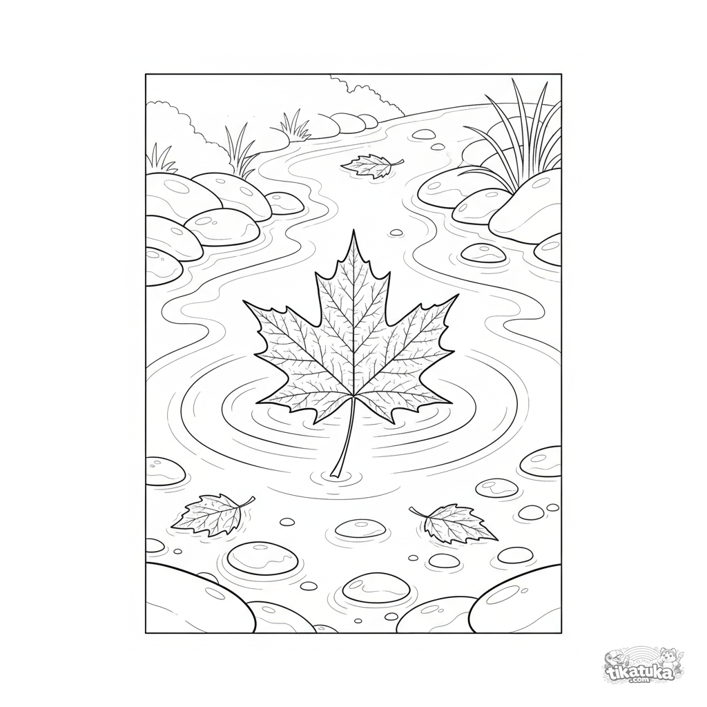 Ausmalbild für 7-9 Jahre: Ein großes, geädertes Ahornblatt treibt mit der Strömung eines klaren Herbstbaches. Detaillierte Illustration der Herbstnatur.