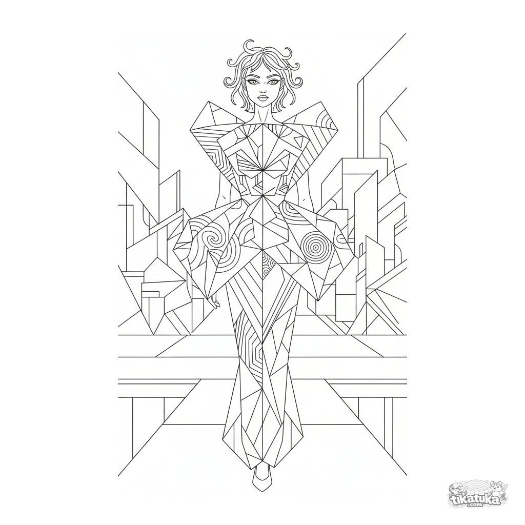 Komplexes Ausmalbild für Mädchen 10-12 Jahre: Ein avantgardistisches skulpturales Kleid aus geometrischen Formen auf dem Laufsteg. Abstraktes Design, minimalistische Szene.