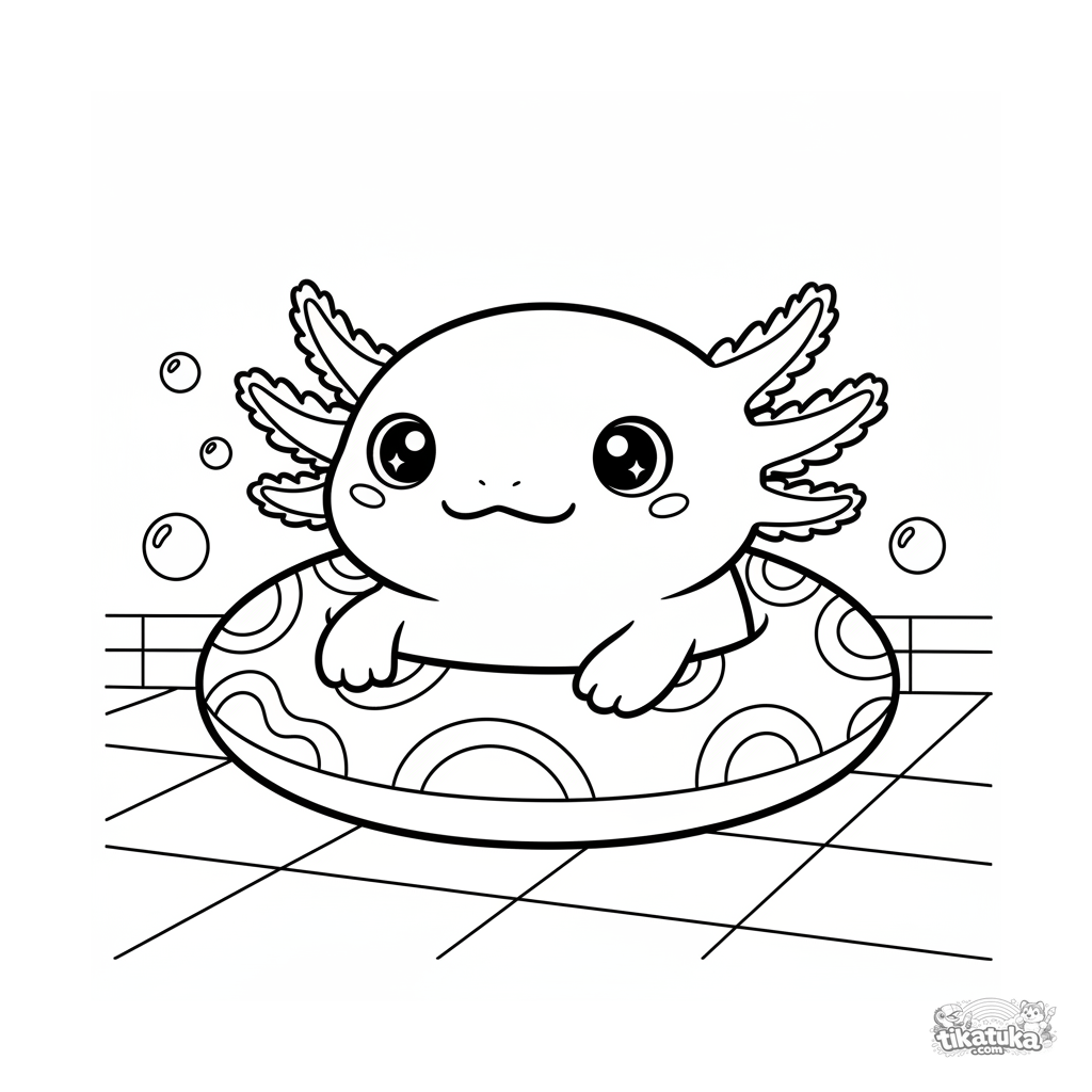 Ausmalbild für Kinder 4-6: Ein niedlicher Axolotl ruht in einem Schwimmring am Boden eines Schwimmbads. Einfache klare Linien, süßer Gesichtsausdruck.