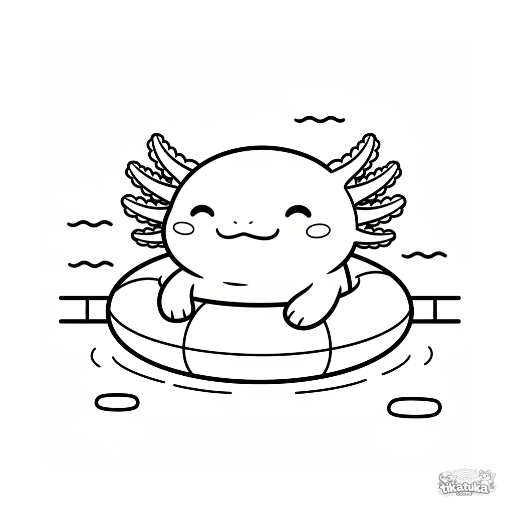 Malmalblatt für Kleinkinder: Ein süßer Axolotl ruht in einem Schwimmring am Boden eines Pools. Einfache, große Formen mit breiten Rändern für einfaches Ausmalen.