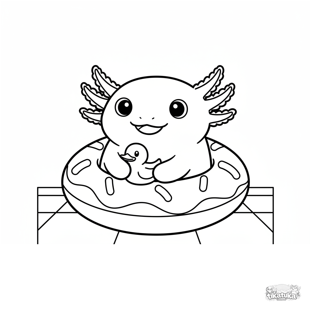 Malseite für Kleinkinder: Ein süßer Axolotl entspannt in einem Schwimmring am Boden eines Pools. Einfache, große Formen mit breiten weißen Rändern.