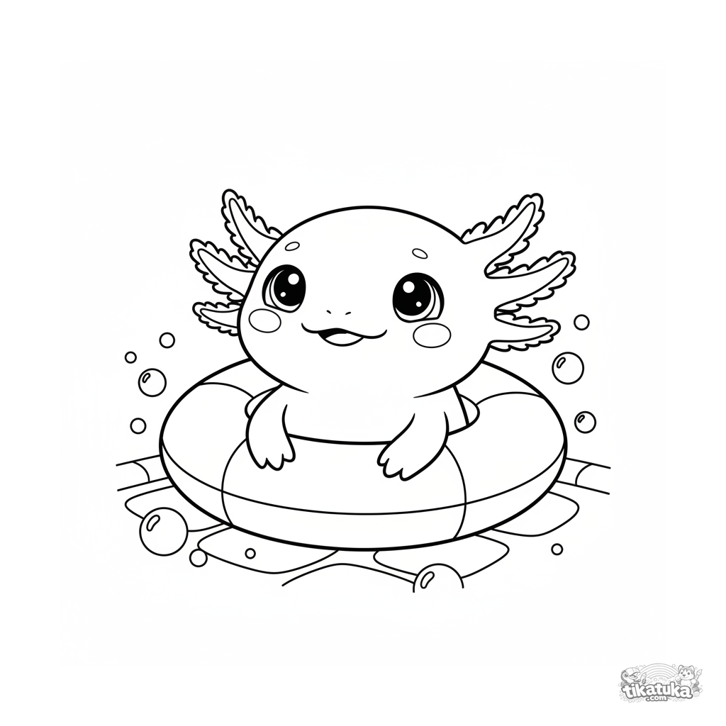 Ausmalbild für Kinder 4-6: Ein lächelnder Axolotl in einem Schwimmring am Boden eines Pools. Niedliche Szene.