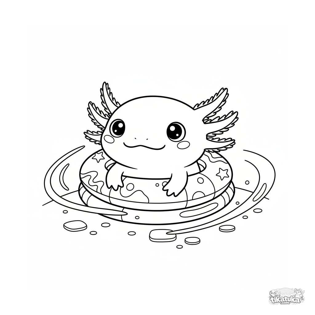 Ausmalbild eines süßen Axolotls, der in Schwimmringen am Boden eines Pools ruht. Eine einfache, niedliche Szene für Kinder von 4-6 Jahren.