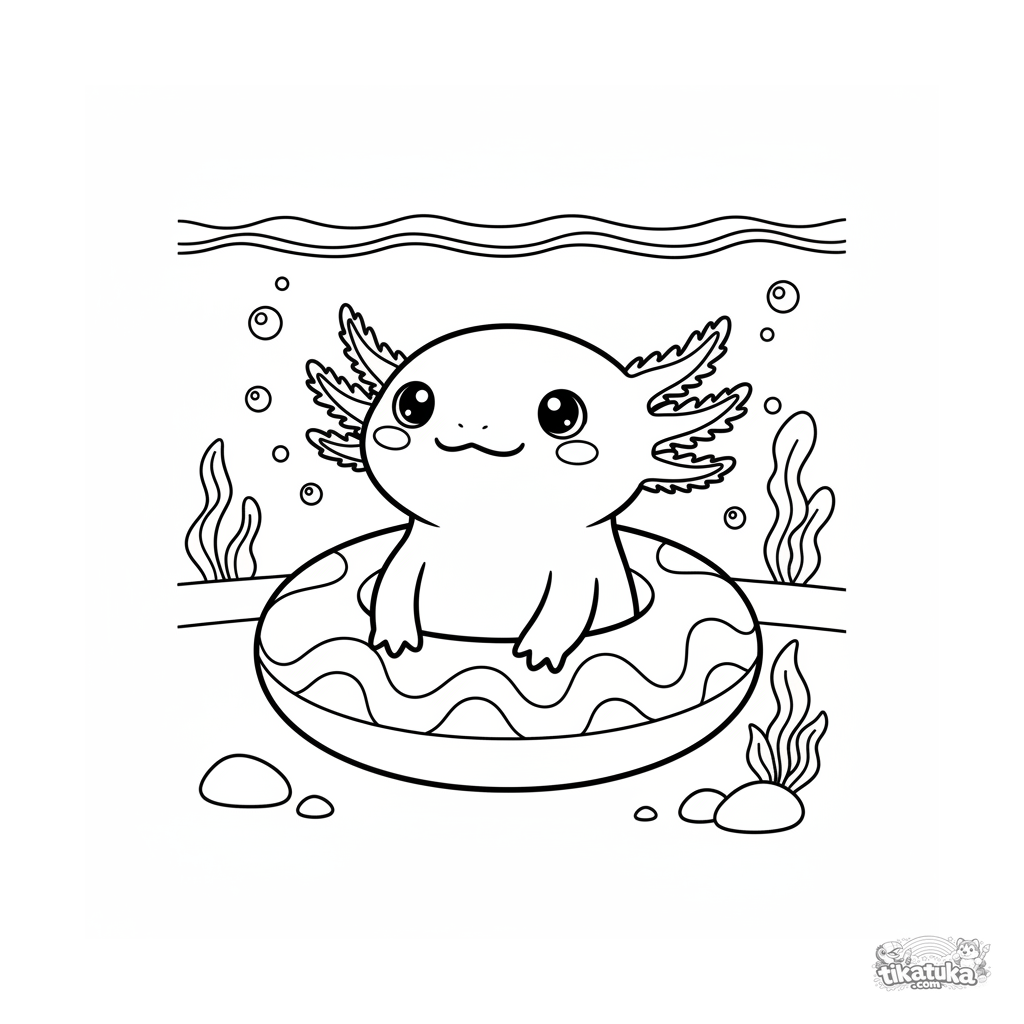 Ausmalbild für Kinder 4-6: Ein süßer Axolotl sitzt in einem Schwimmring am Boden eines Pools, mit Blasen um ihn herum.