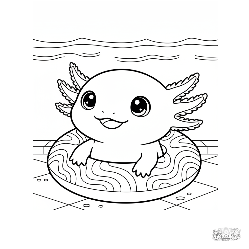 Ausmalbild eines süßen Axolotls, der in einem Schwimmring am Boden eines Pools sitzt. Für Kinder von 4 bis 6 Jahren.