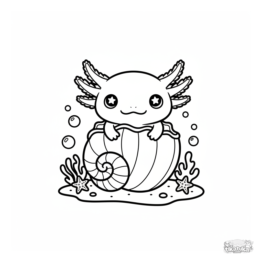 Einfaches Ausmalbild für Kleinkinder 2-3: ein süßer Axolotl mit federigen Kiemen lugt aus einer großen Muschel auf dem sandigen Meeresboden zwischen Seesternen und Korallen.