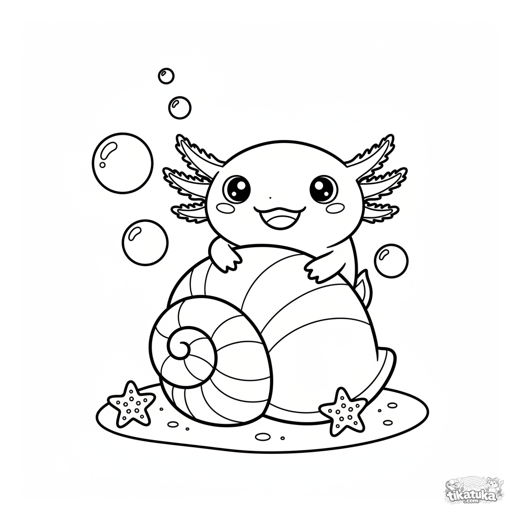 Einfaches Ausmalbild für Kleinkinder mit einem süßen Axolotl, der aus einer riesigen Muschel lugt. Große Formen, Blasen und breite Ränder.