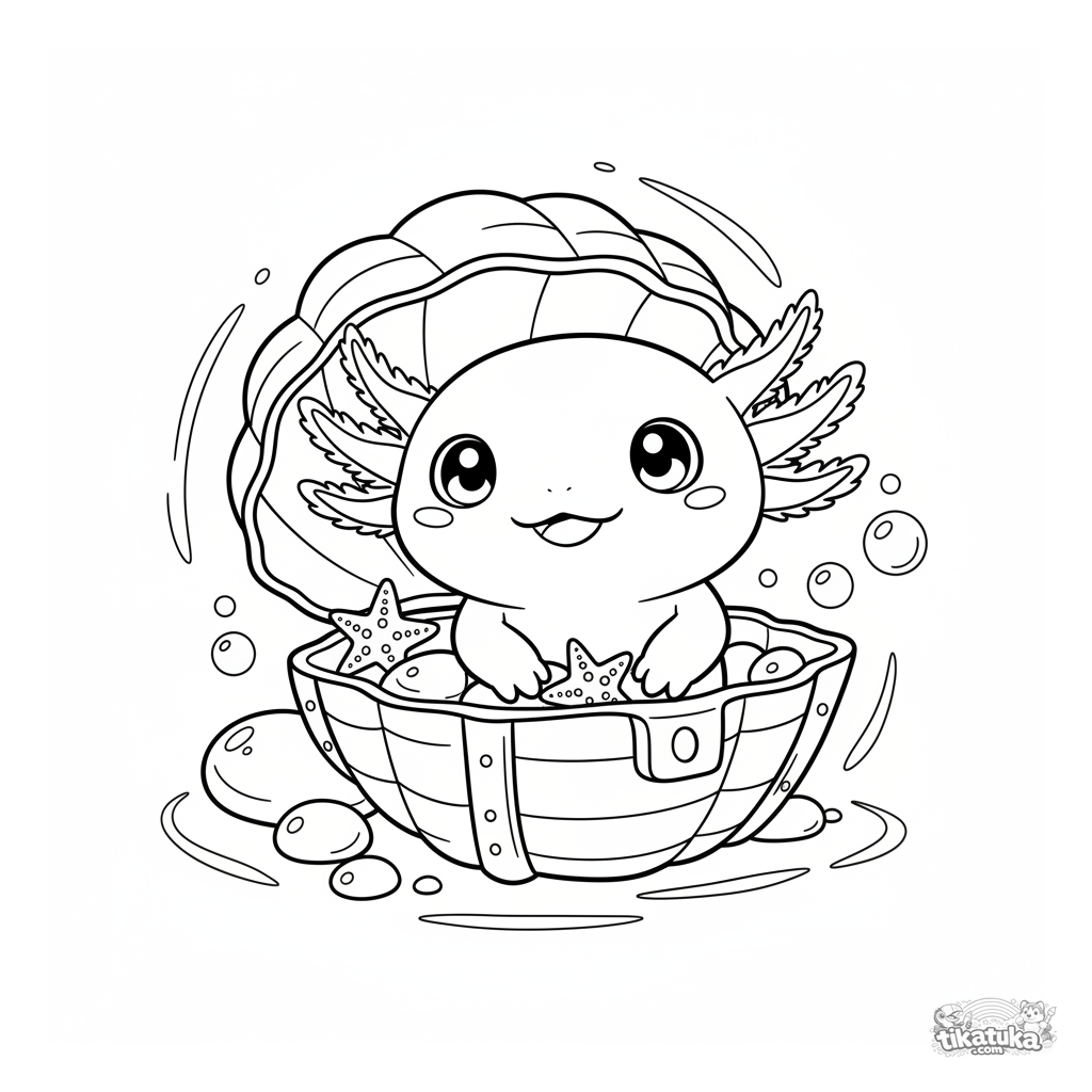 Kinder-Ausmalbild: ein süßer, lächelnder Axolotl mit federigen Kiemen lugt aus einer großen Muschel, die wie eine Schatztruhe aussieht.