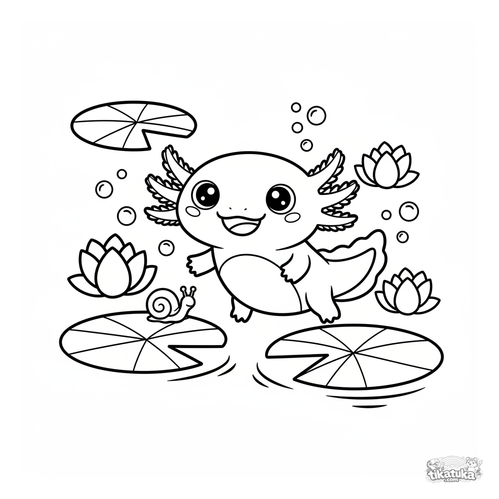 Einfaches süßes Ausmalbild für Kleinkinder 2-3: ein lächelnder Axolotl schwimmt zwischen großen Seerosenblättern und weißen Blüten in einem Teich, mit Blasen überall.