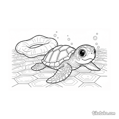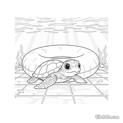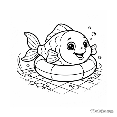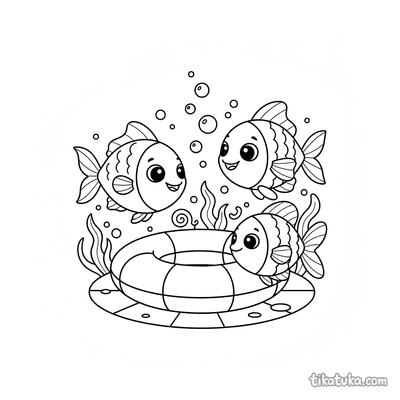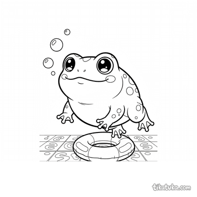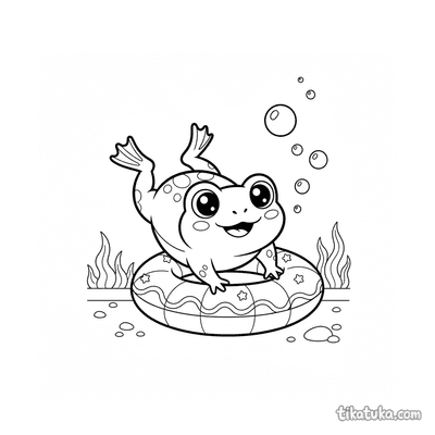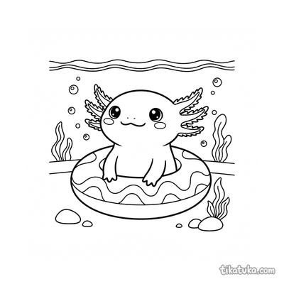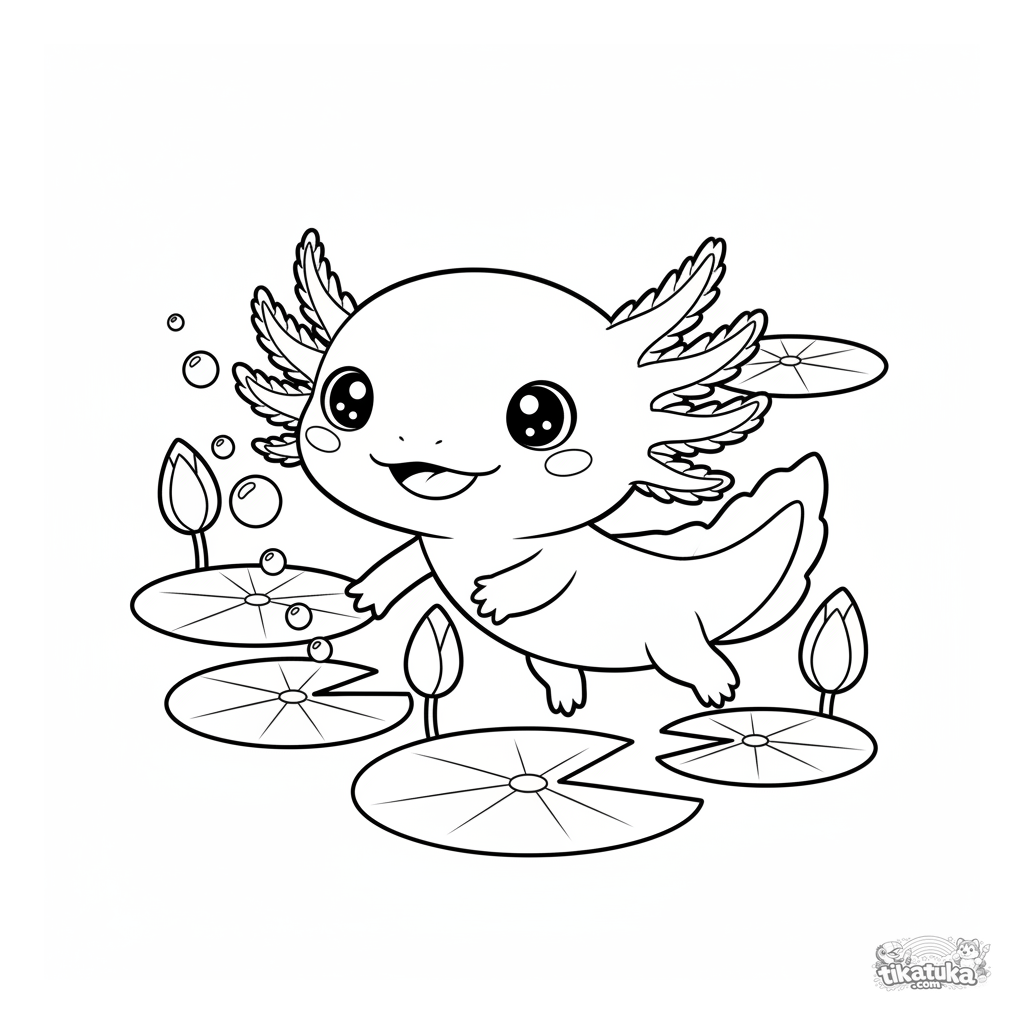 Ein Ausmalbild für Kinder von 4-6 Jahren mit einem süßen Axolotl, der zwischen Seerosen in einem Teich schwimmt. Verspielte und ruhige Unterwasserszene mit Blasen.