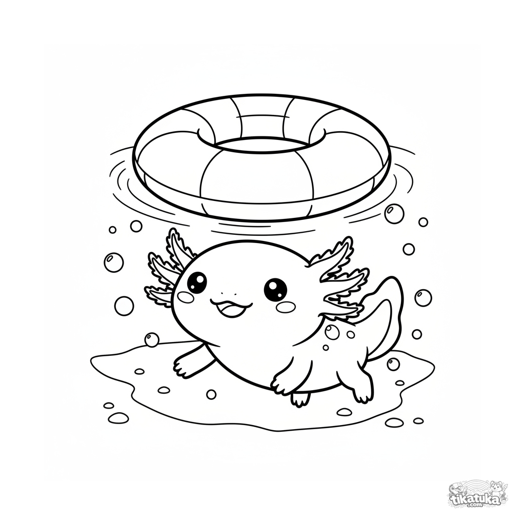 Ausmalbild für Kinder 4-6: Ein lächelnder Axolotl schwimmt unter einem Schwimmring am Poolboden. Niedliche Merkmale und Bläschen zum Ausmalen.
