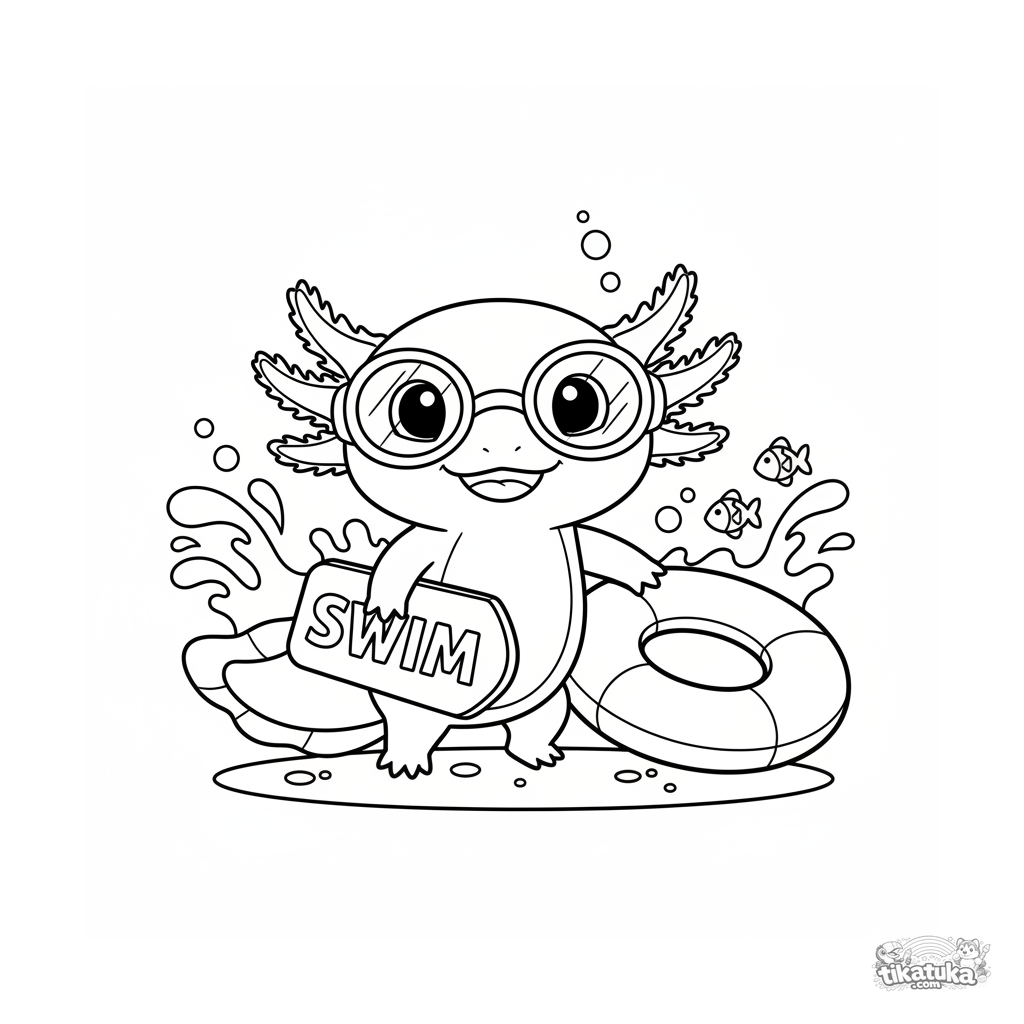Ausmalbild für Kinder 4-6: Ein fröhlicher Axolotl mit Schwimmbrille hält ein Kickboard, bereit für den Unterricht am Poolboden.